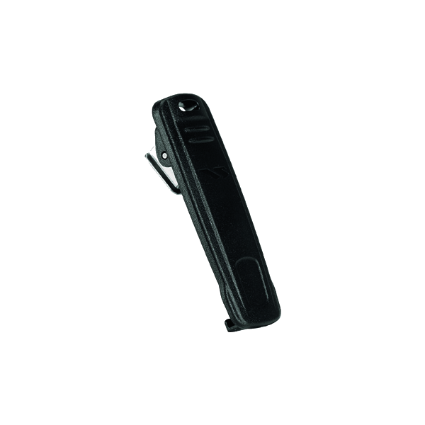 Spring action belt clip holds the radio in place on a belt.